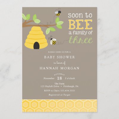 Bee theme Baby Shower invitation. Soon to BEE a family of three in a fun handwritten script featuring a honeycomb and bees. Different color backgrounds available. Personalize with your information or click "click to customize further" to adjust font type size color.