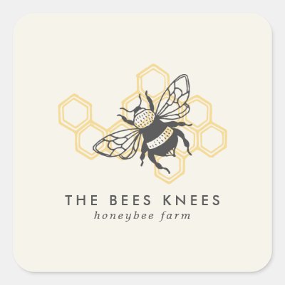 Vintage Bee Logo Rustic Honeybee Beekeeper Square Sticker. This trendy design features a black honeybee against a yellow honeycomb background. The perfect apiary design for a beekeeper business.
