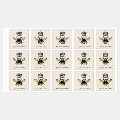 Regal queen bee and crown waterproof self adhesive product labels for a seller of fine honey products beeswax candles or soap or any honey bee derived products.For an artisan maker apiary or farm. Whimsical and unique.