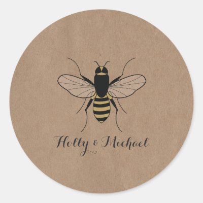 A sticker featuring an illustration of a honey bee. Personalize with your names. Background is brown paper cardboard inspired. Look for matching wedding invitations and more at Jill's Paperie.